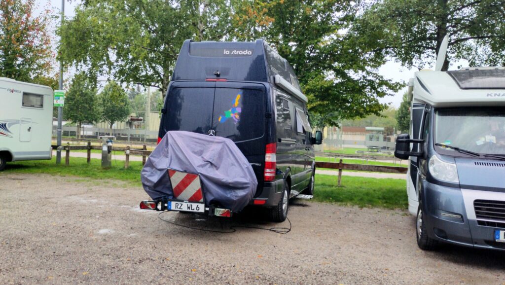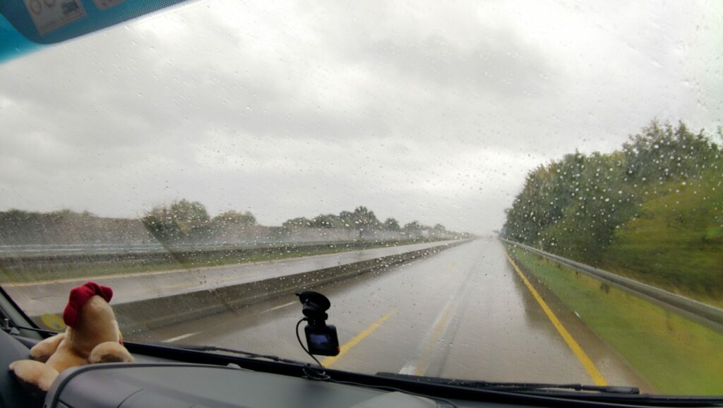 Das Wetter unterwegs ist ausgesprochen nass und windig, so kommen wir eher gemächlich voran, das passt schon. Je mehr wir nach Süden fahren, desto aggressiver fahren die Leute aber auch, denn es ist überall voll und jeder hat es eilig. So sehen wir viele Unfälle und sind froh, nicht selbst betroffen zu sein.