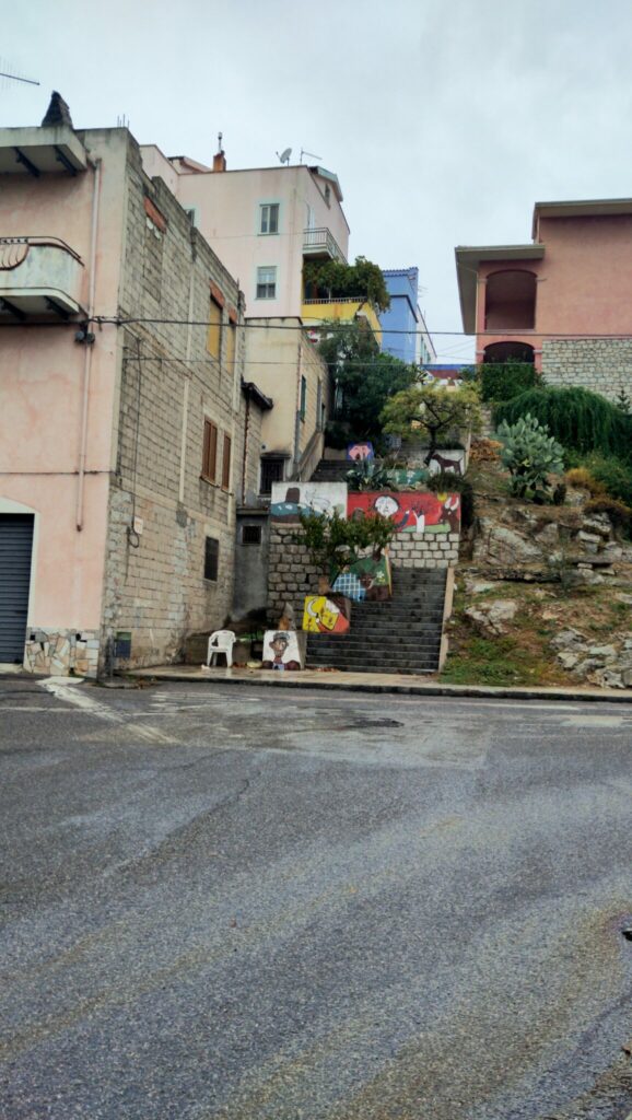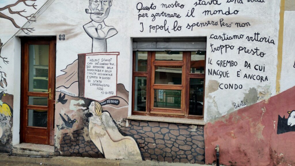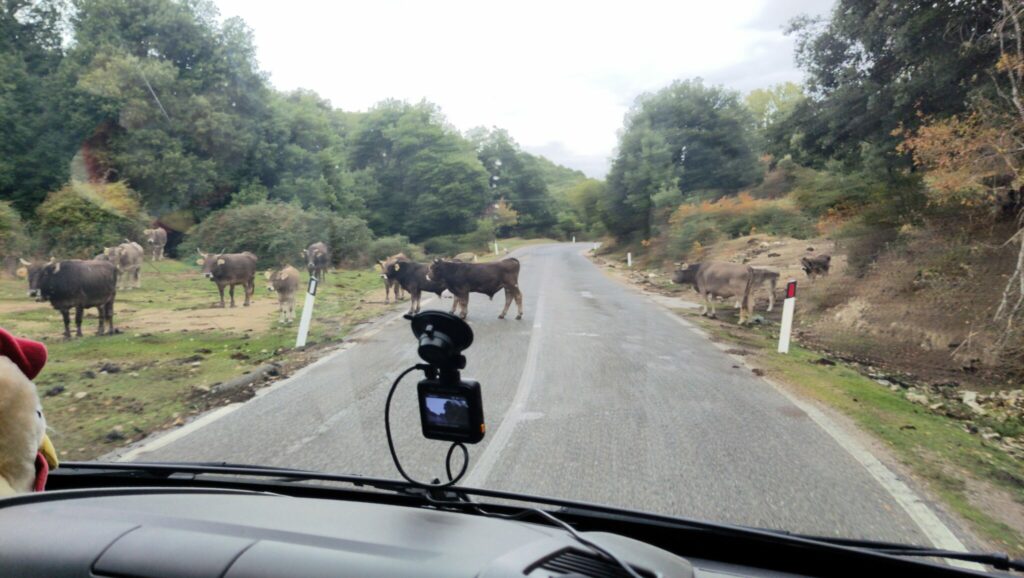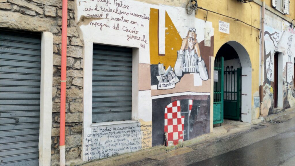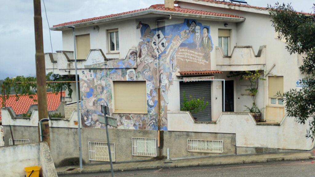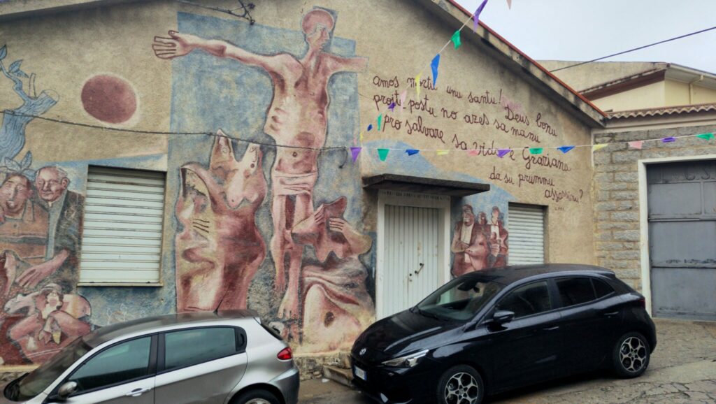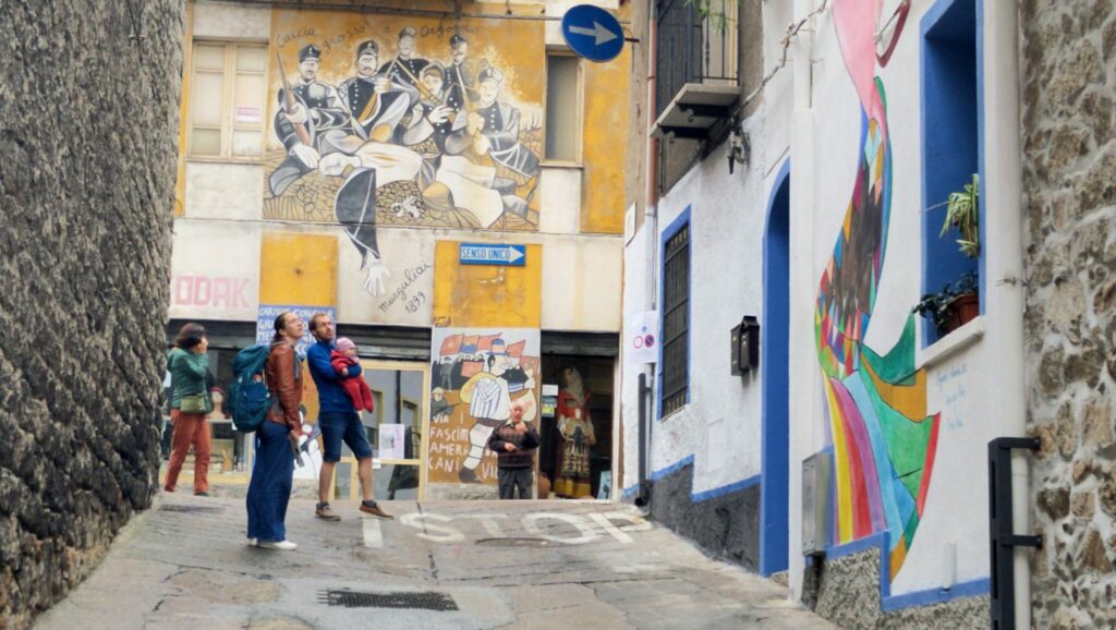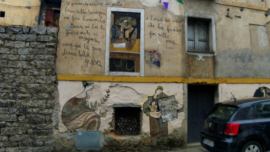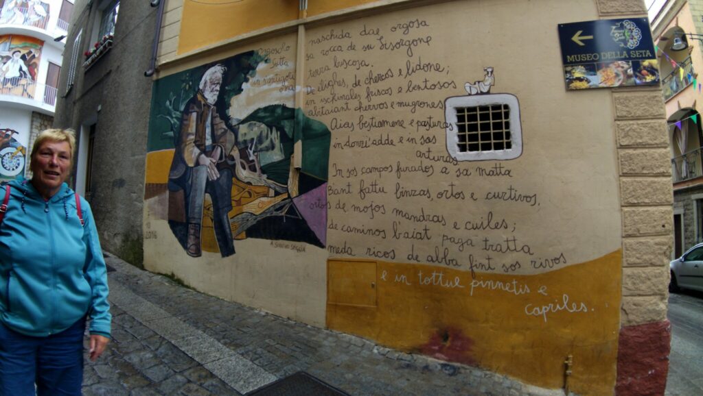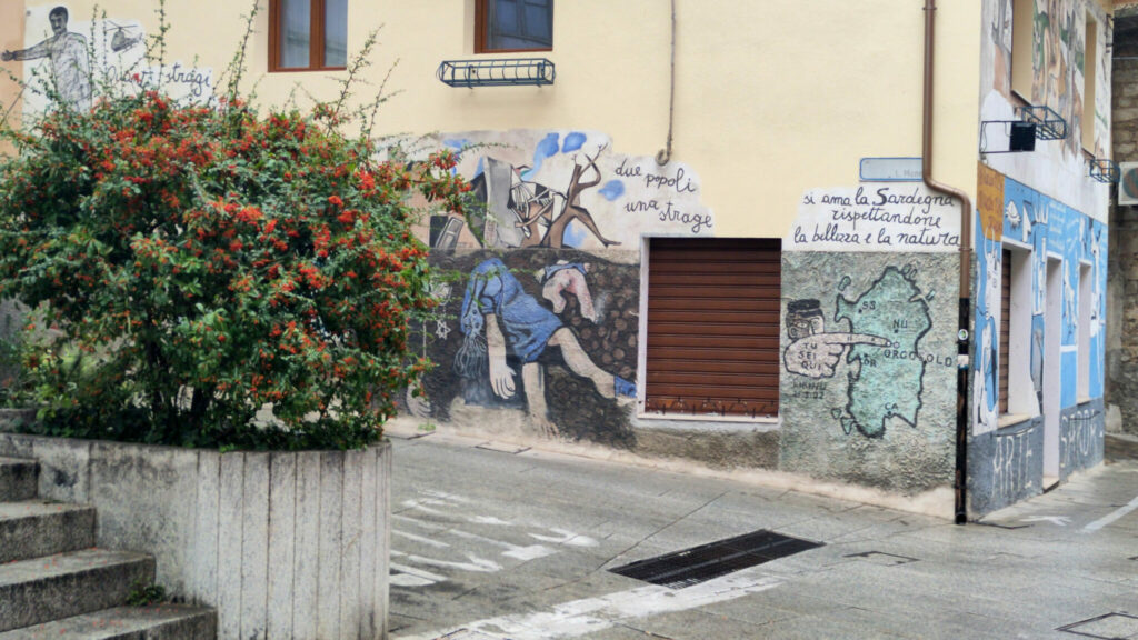 Weiter geht’s den Berg hoch. Bis auf ein paar Kühe und jede Menge Serpentinen wenig zu erzählen. Die angeblich so praktischen Parkplätze in Orgosolo erweisen sich jedoch als schwierig zu erreichen durch winzige, steile Straßen – und voll. Kurz entschlossen parken wir außerhalb und gehen zu Fuß – so groß ist der Ort ja gar nicht.