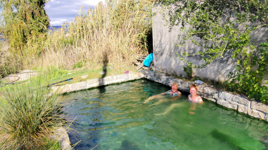 Lange müssen wir nach dem Becken nicht suchen. Auf dem Platz, den wir für so einsam hielten, halten ständig irgendwelche Italiener, die baden wollen, unter anderem zwei Wohnmobile mit italienischen Großfamilien drin – schon wissen wir, wo wir am nächsten Tag hinwollen. Gegen Abend lässt der Regen nach und wir haben eine ruhige Nacht.