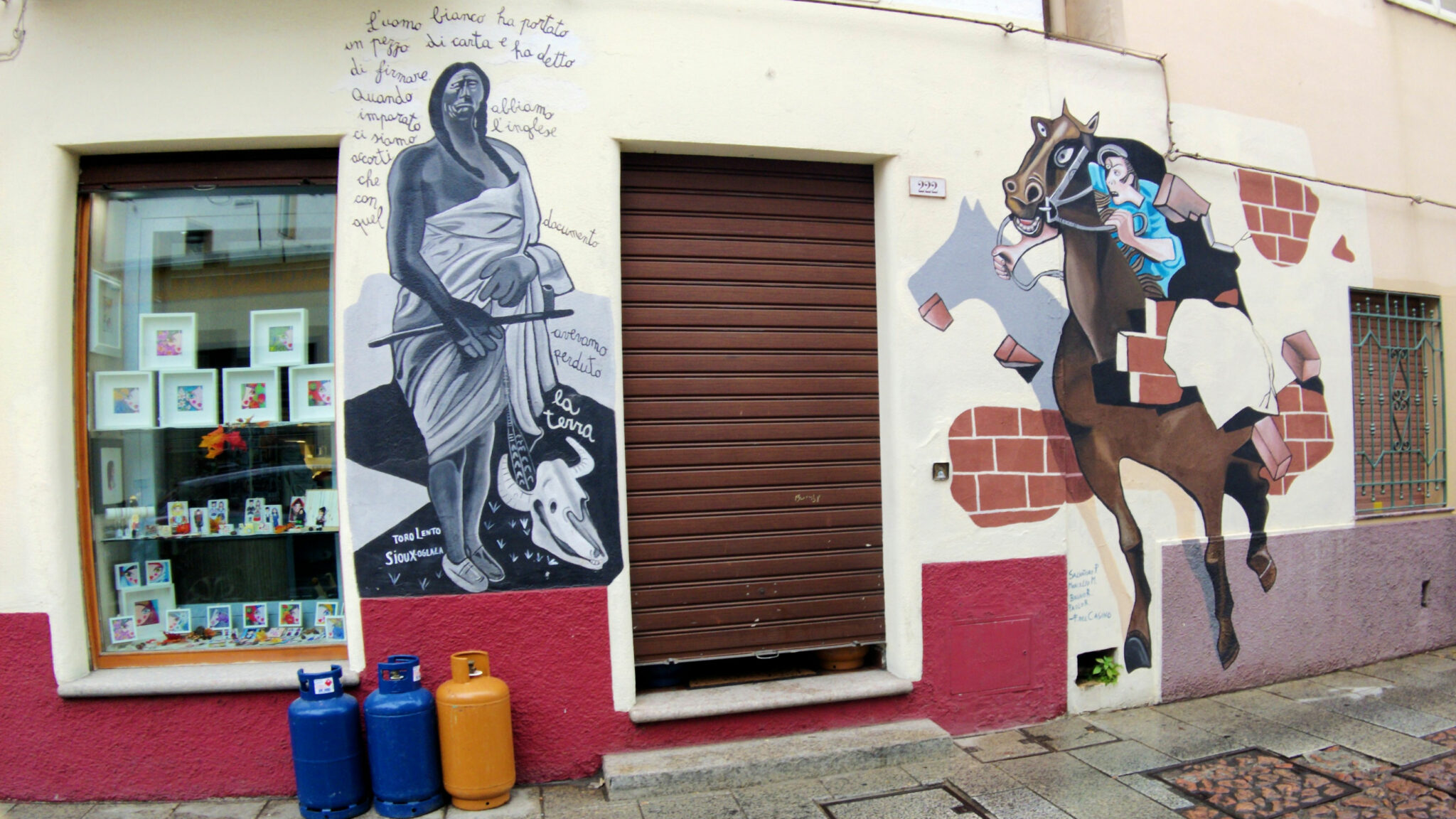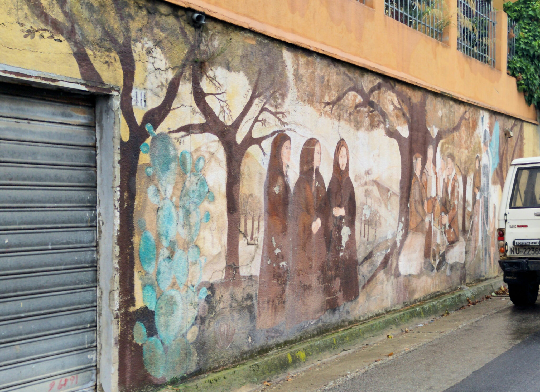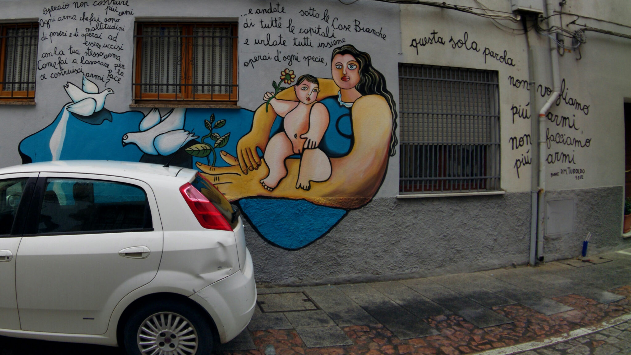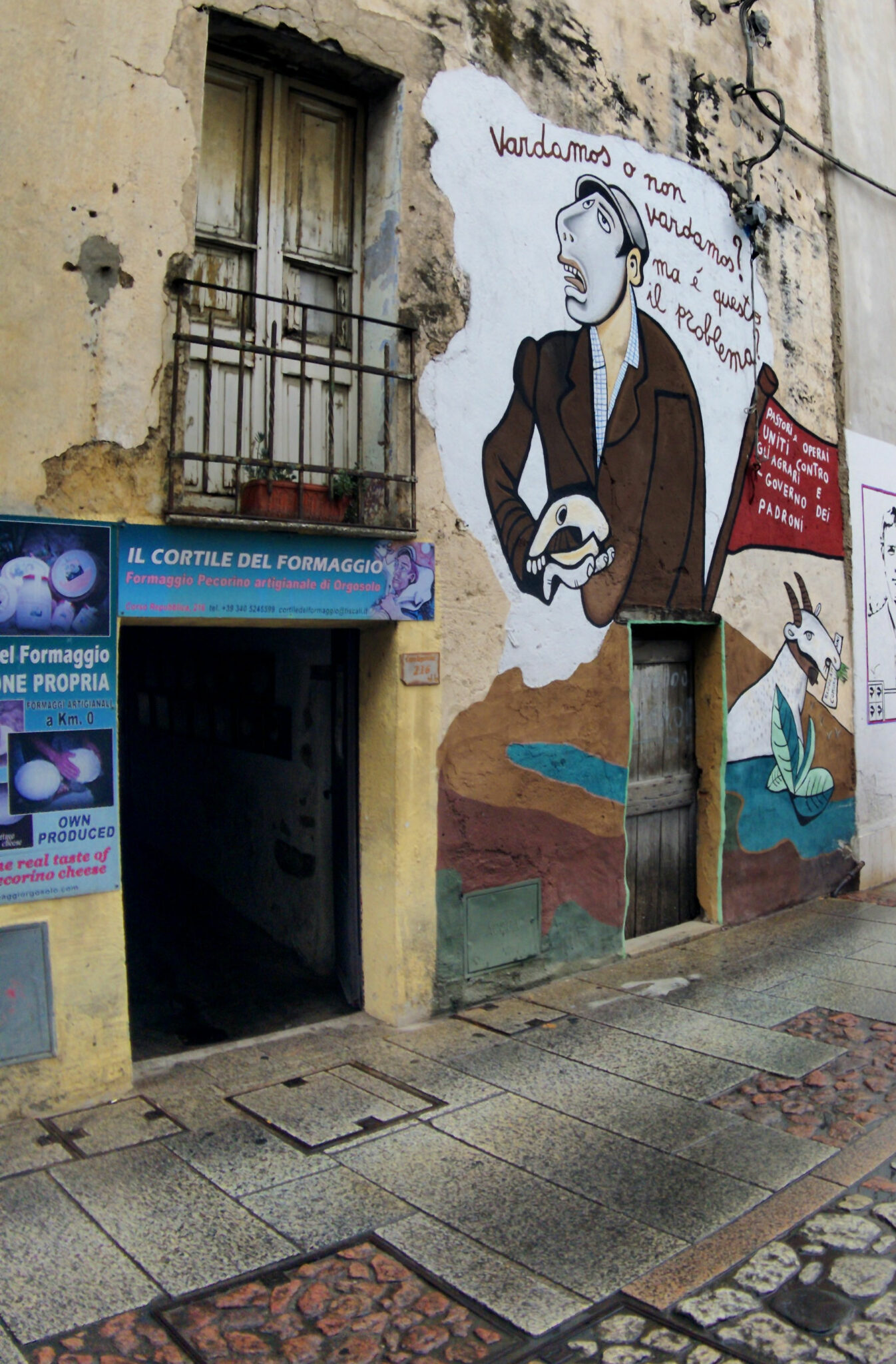 Weiter geht’s den Berg hoch. Bis auf ein paar Kühe und jede Menge Serpentinen wenig zu erzählen. Die angeblich so praktischen Parkplätze in Orgosolo erweisen sich jedoch als schwierig zu erreichen durch winzige, steile Straßen – und voll. Kurz entschlossen parken wir außerhalb und gehen zu Fuß – so groß ist der Ort ja gar nicht.