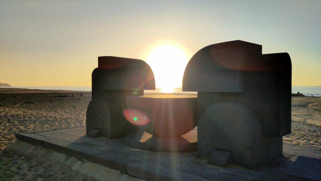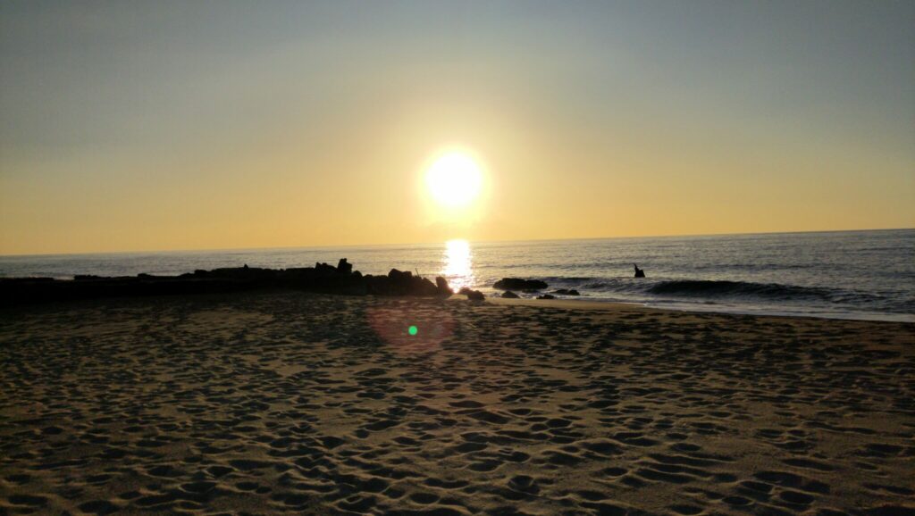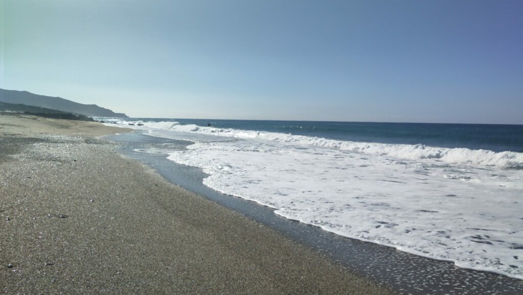 Aber der Wind ist weg und das Meer friedlich, der Wetterbericht hatte recht. Baden kann man leider trotzdem nicht – zu viele Wellen. Aber wir genießen das Sonnenwetter sehr.