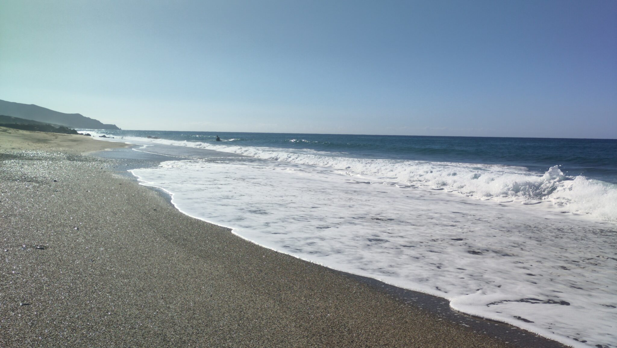 Aber der Wind ist weg und das Meer friedlich, der Wetterbericht hatte recht. Baden kann man leider trotzdem nicht – zu viele Wellen. Aber wir genießen das Sonnenwetter sehr.