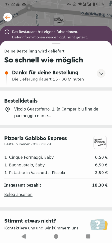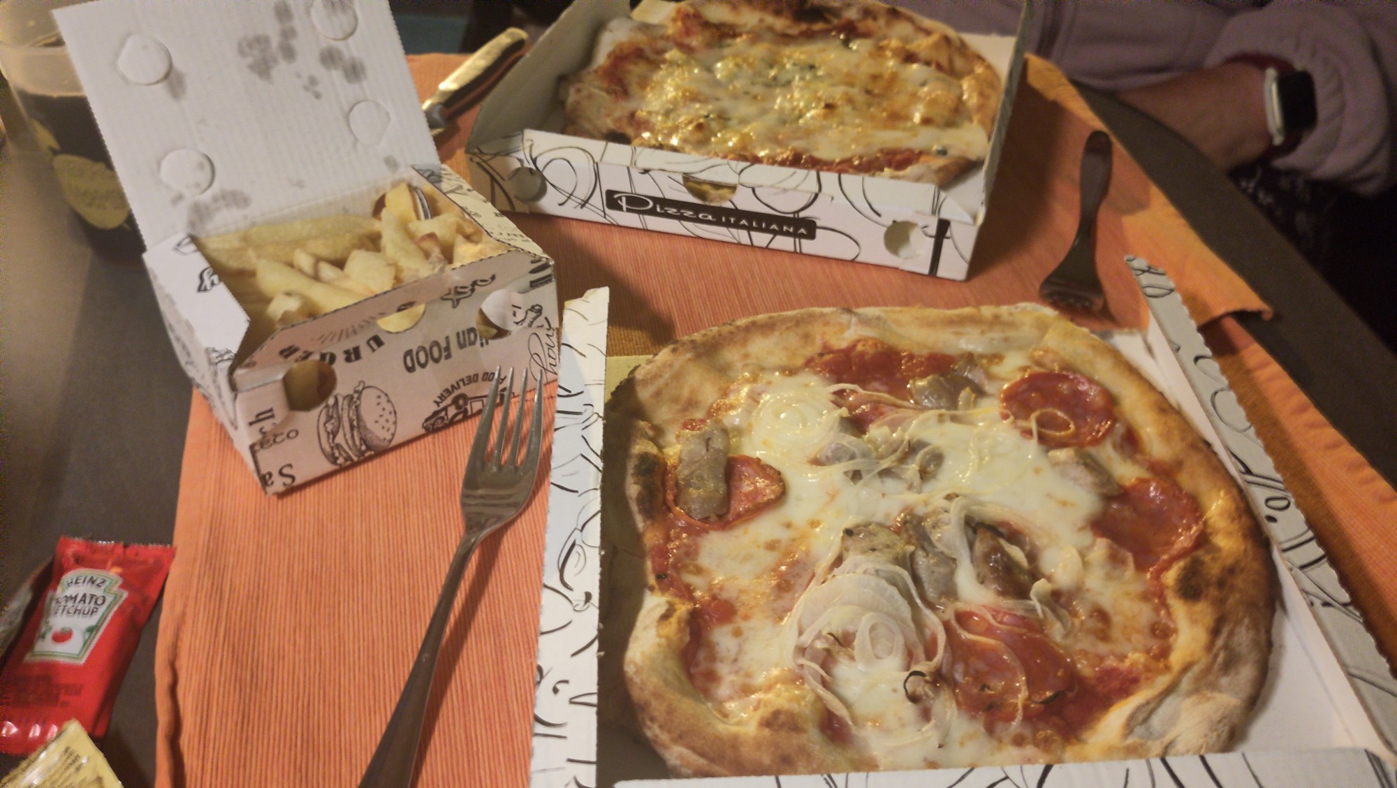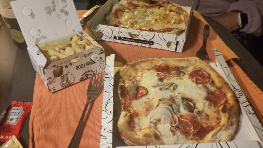 Abends gibt es Pizza vom örtlichen Pizzaservice – auch in Italien gibt es natürlich Lieferando und die Lieferung klappt prima. Dann noch der deutschen Mannschaft beim gewinnen zusehen, könnte schlechter laufen.