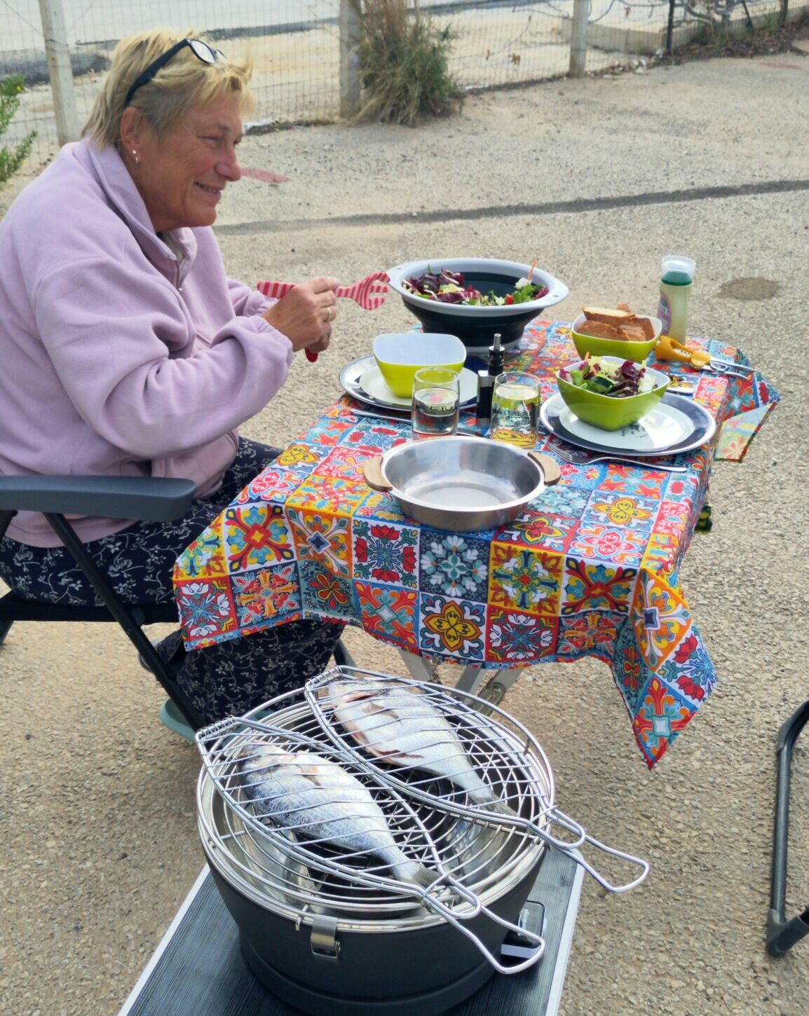 Am Donnerstag schaut die Sonne wieder heraus, und das Thermometer klettert bis auf 20°C, so gibt es das bereits bewährte Nachmittagsgrillen – einfach weil es da am wärmsten ist. Ein bisschen Rücksicht auf die Helligkeit mag man im November schon nehmen. Die Tage sind zwar eineinhalb Stunden länger als zuhause, aber trotzdem noch recht kurz. Wie gut, dass man manche Arbeitsaufgaben auf den Abend verlegen kann, wo es eh dunkel ist.