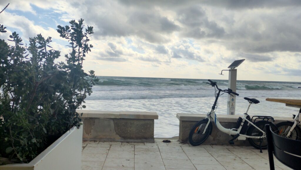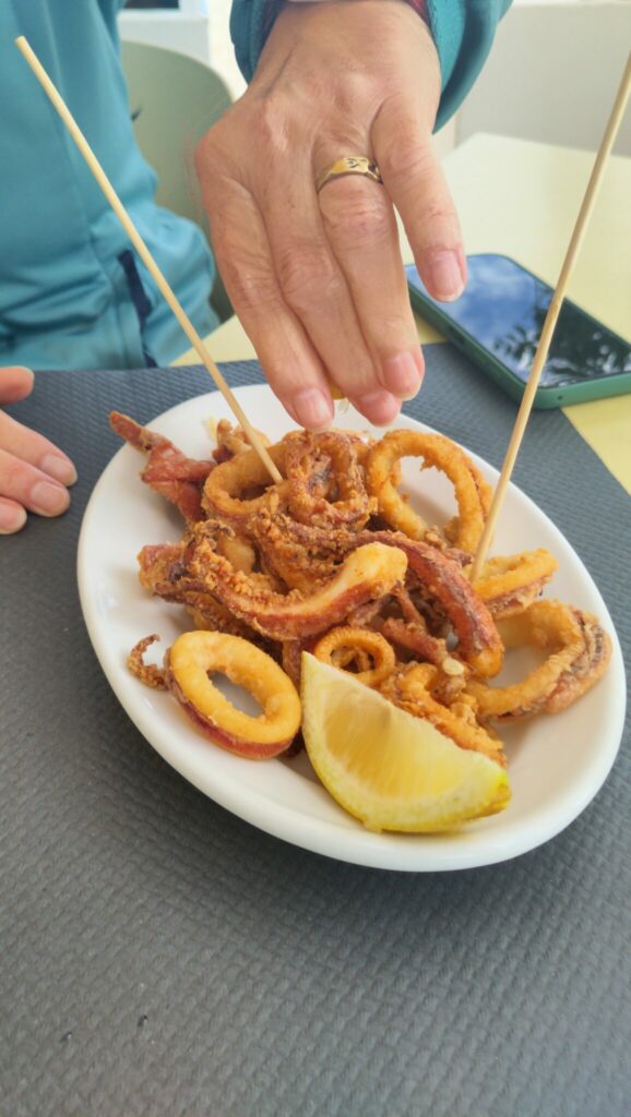 Dolles Wetter, dolle Wellen! Wir fahren zum Punto Secca, sitzen da direkt am Strand in Sonne und Wind und genießen mega leckere Tintenfischsachen und dazu einen Limoncello Spritz, sehr fein.