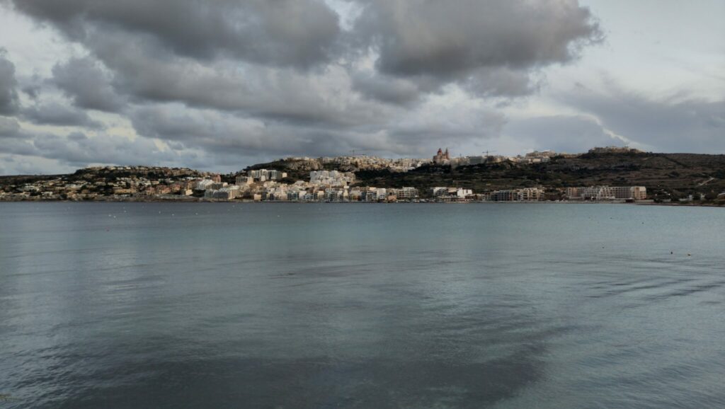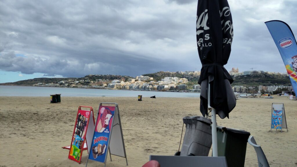 Wir verlassen den Platz im Schlamm. In der Nacht hat es geschüttet und gestürmt, alles klebt, schön ist anders. Irgendwie kommen wir los. Entsorgen im Nassen, alles im Nassen. Wir fahren zum Lidl in Mosta, der hat einen großen Parkplatz. Erstmal beruhigen und weniger schlammige Sachen anziehen, dann gehen wir einkaufen – die Vorräte sind ja doch ziemlich leer.