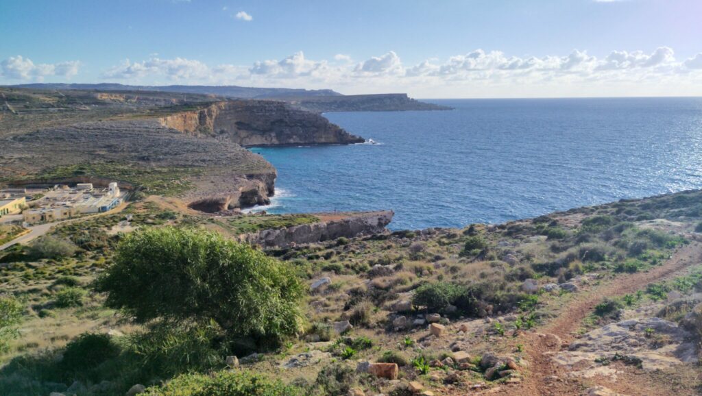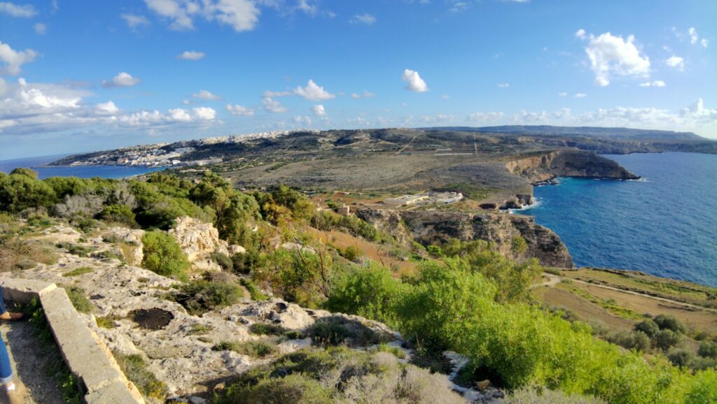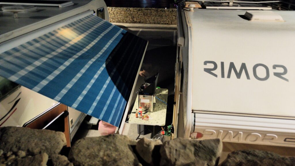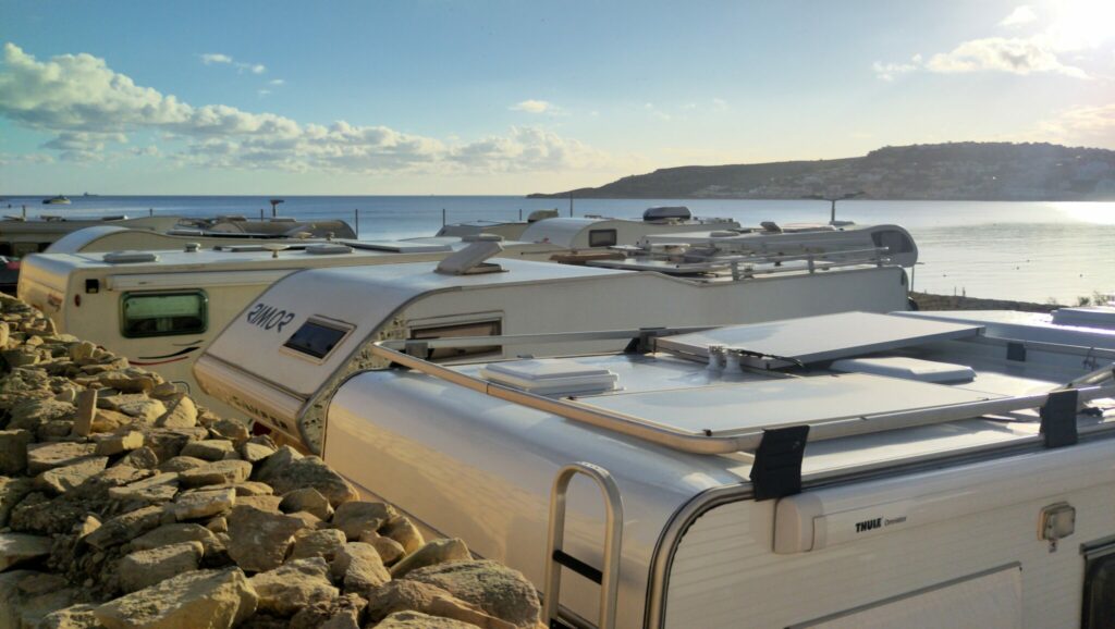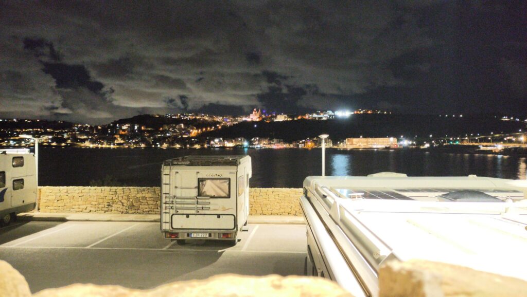 Der Platz gefält uns gut. Tolle Aussicht, nette Nachbarn aus der Schweiz, und jede Menge maltesische Wohnmobile – alle verlassen, die werden wohl nur am Wochenende benutzt. Und windgeschützt ist es, das tut uns gut. Dafür gibt es nichts, keinen Strom, keine Entsorgung, kein Wasser. Die Nachbarn kennen das Problem, man wurschtelt sich so durch auf Malta.