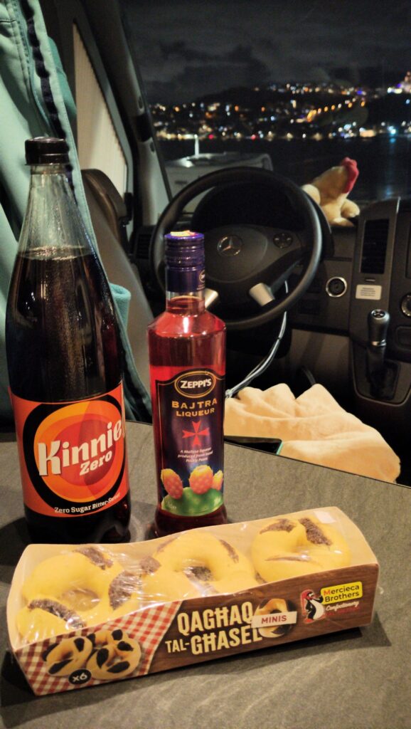 Das war fein! Der Uber bringt uns wieder nach hause, wo inzwischen deutlich mehr Malteser da sind. Ach ja, Bajtra, den maltesischen Feigenlikör, haben wir auch, nun ist also mit Kinnie, Bajtra und Qagħaq tal-Għasel nun der Kanon der maltesischen Spezialitäten vollständig 😉 Kinnie ist die maltesische Antwort auf Cola: bittersüß, sehr anders. Man gewöhnt sich schnell daran.