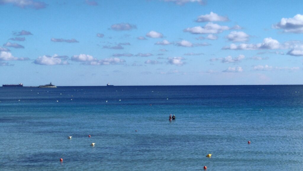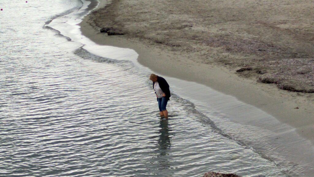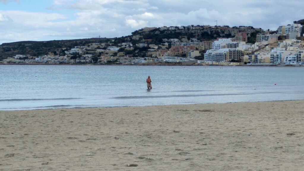 Ein Stück den Berg runter ist ein dänisches Feriendorf. Wir suchen und finden dort Waschmaschinen, die wir benutzen wollen, wenn wir von Gozo zurückkommen. Andrea ist fasziniert von Leuten, die baden und will mindestens die Füße im Wasser haben. Anne friert und macht lieber Fotos davon.