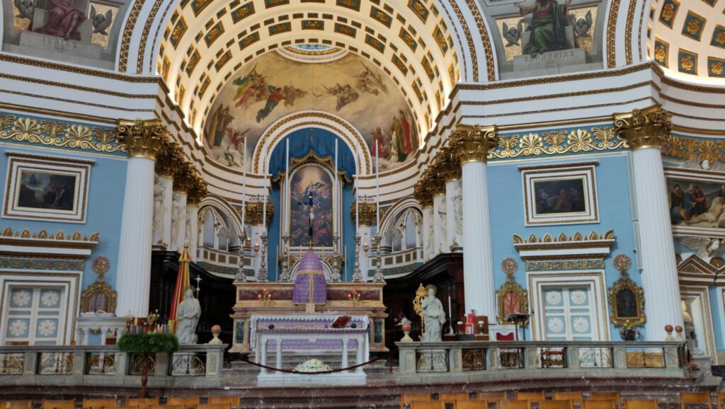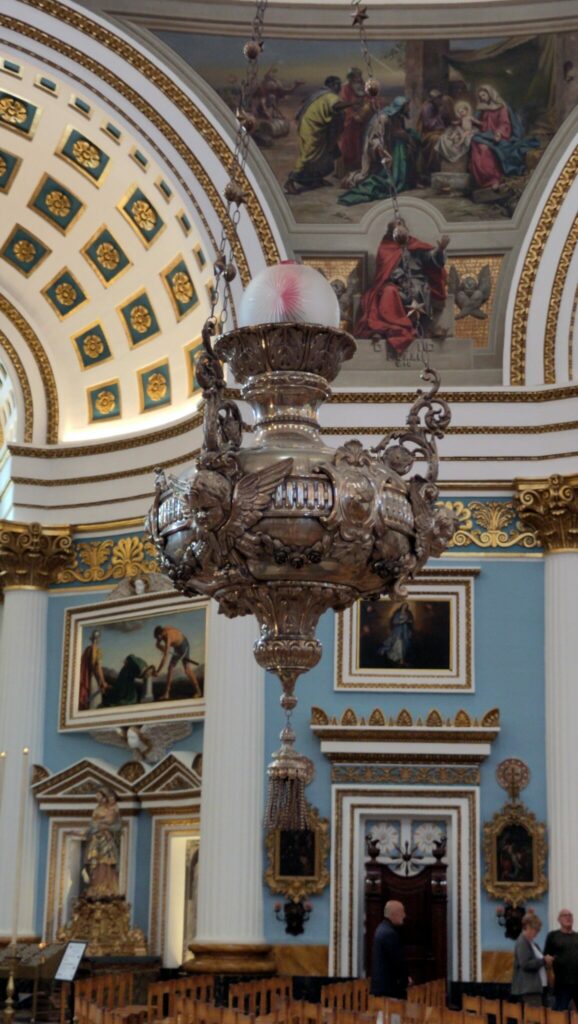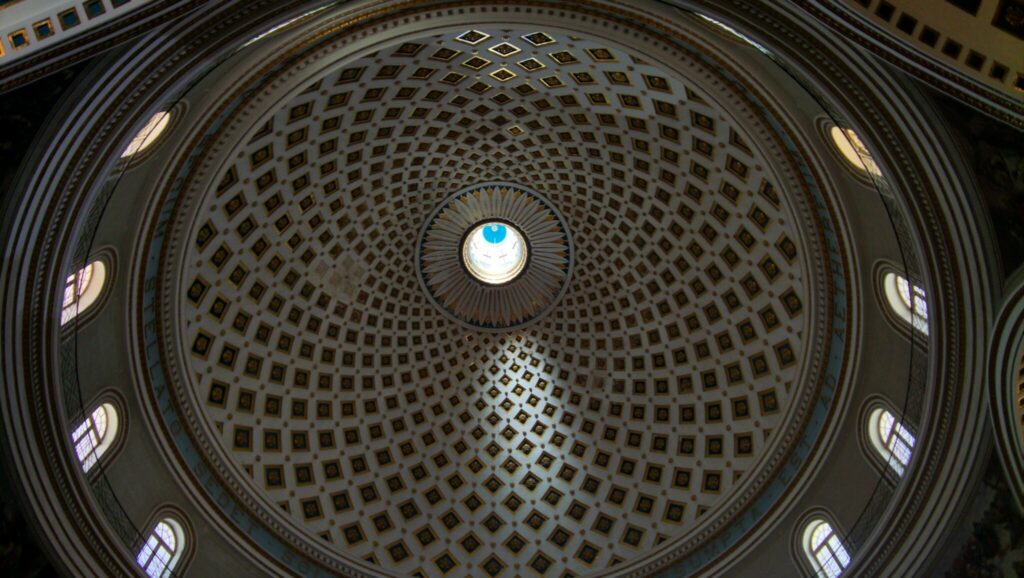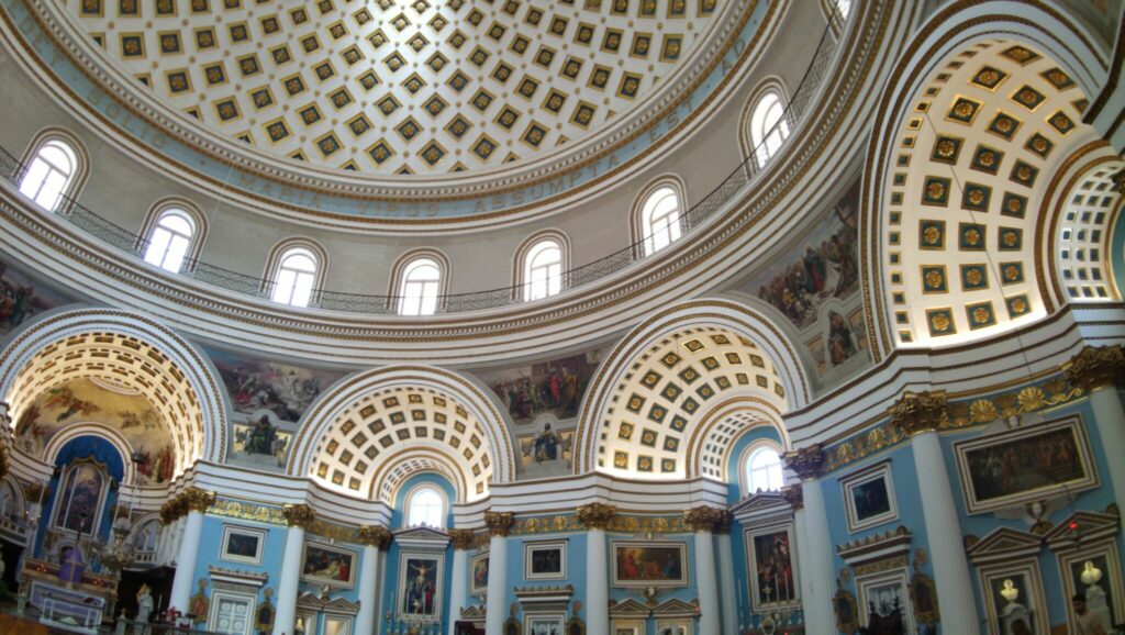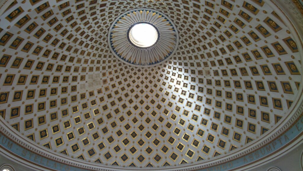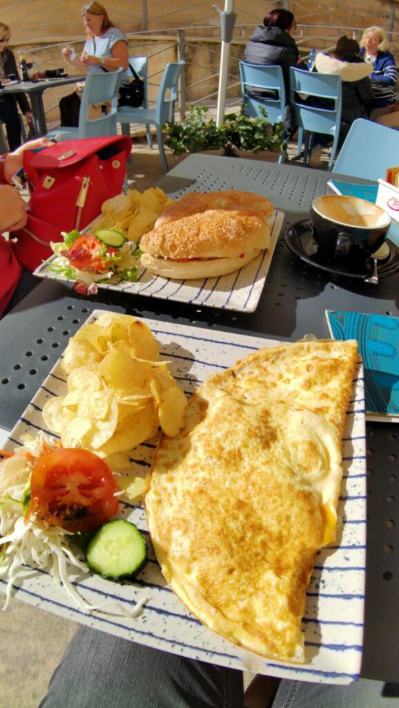 Bus fahren klappt gut, nach einer Dreiviertelstunde sind wir in Mosta. Was will man hier? Eigentlich nur den Dom angucken (oder doch die Basilika? Die Einheimischen sagen Rotunda, ist wohl am einfachsten). Die größte freitragende Kuppel der Welt sagen sie. Ist auch echt groß. Aber erstmal zweites Frühstück. Es gibt maltesisches Omelett und Ftira, eine Art belegtes Fladenbrot, gibt es hier an jeder Ecke.