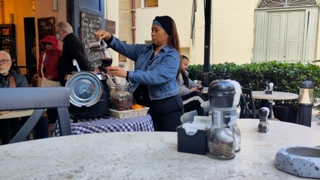 So langsam tun uns die Füße weh. Wir halten an einer Bar. Es gibt Kaffee, Kekse – und maltesischen Glühwein, der doch sehr anders schmeckt, als wir das gewohnt sind.