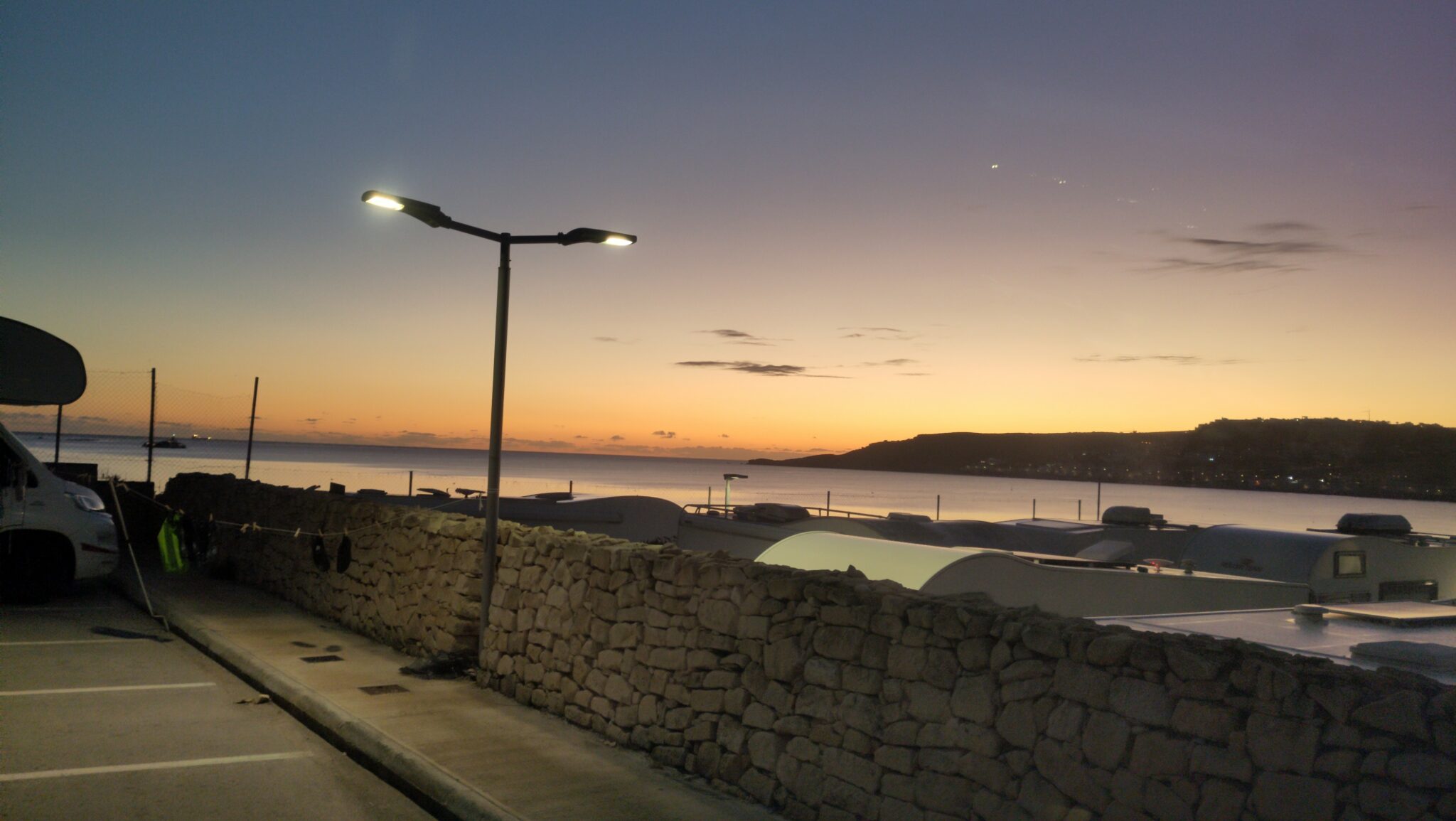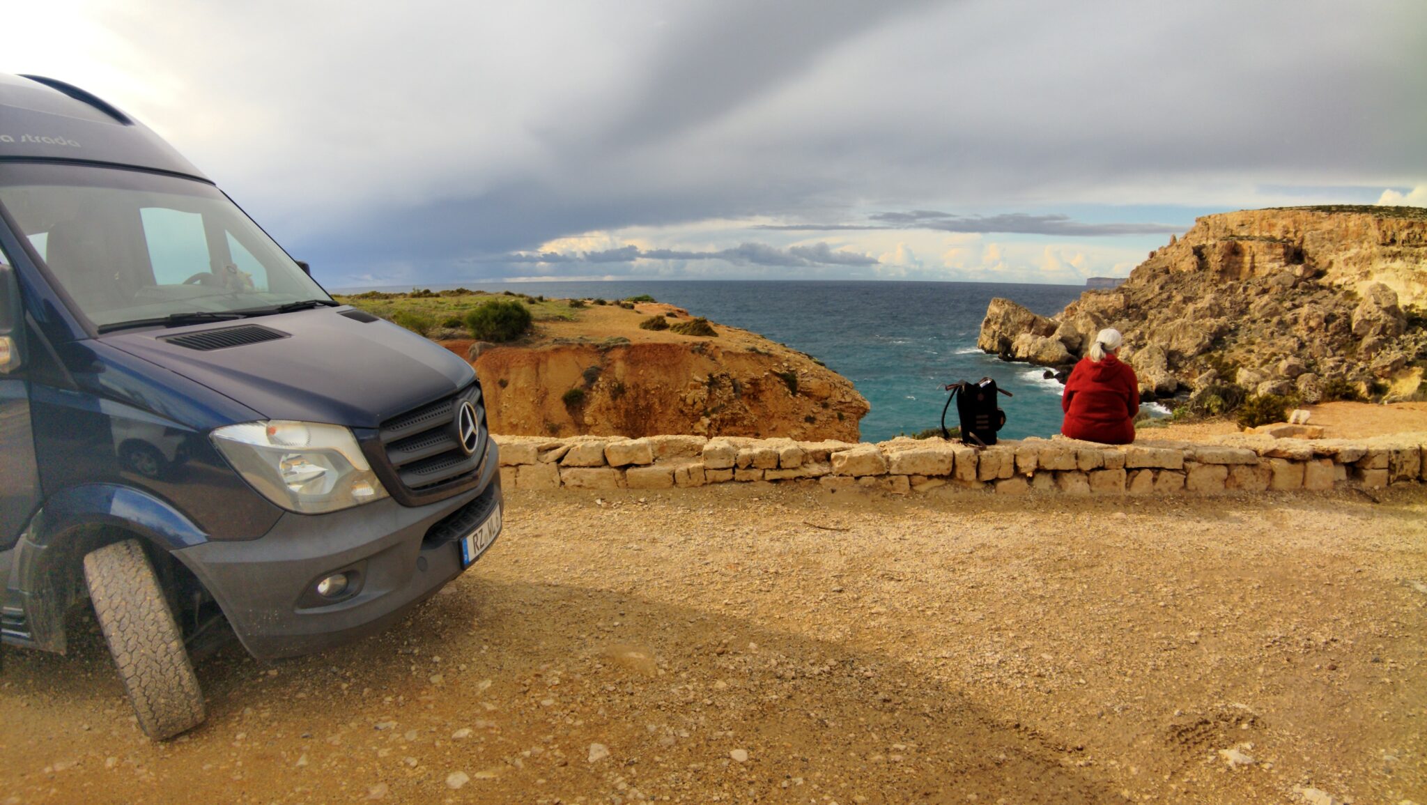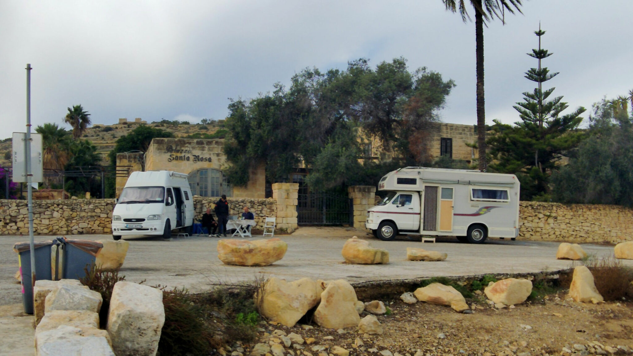 Der Platz gefält uns gut. Tolle Aussicht, nette Nachbarn aus der Schweiz, und jede Menge maltesische Wohnmobile – alle verlassen, die werden wohl nur am Wochenende benutzt. Und windgeschützt ist es, das tut uns gut. Dafür gibt es nichts, keinen Strom, keine Entsorgung, kein Wasser. Die Nachbarn kennen das Problem, man wurschtelt sich so durch auf Malta.