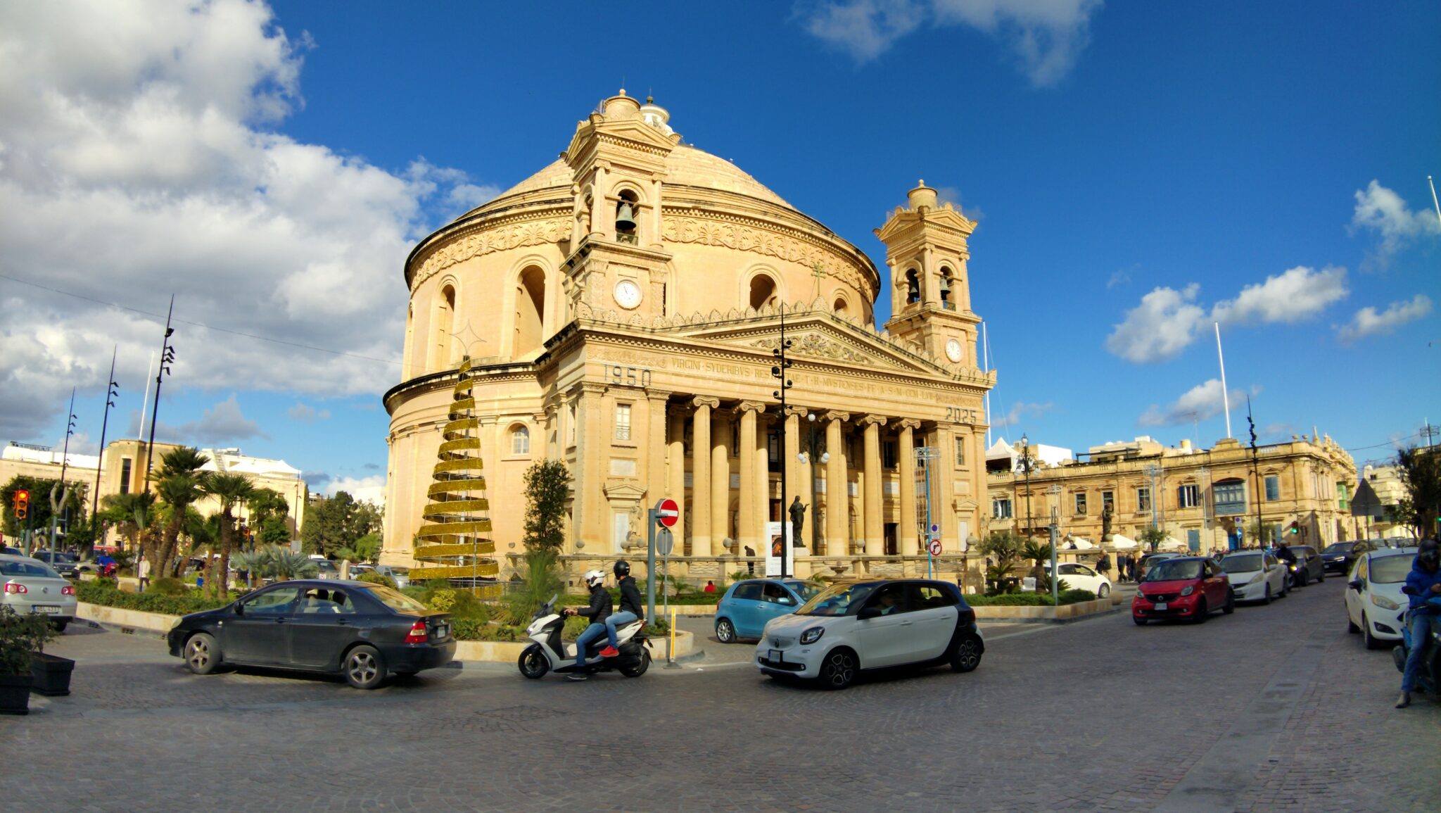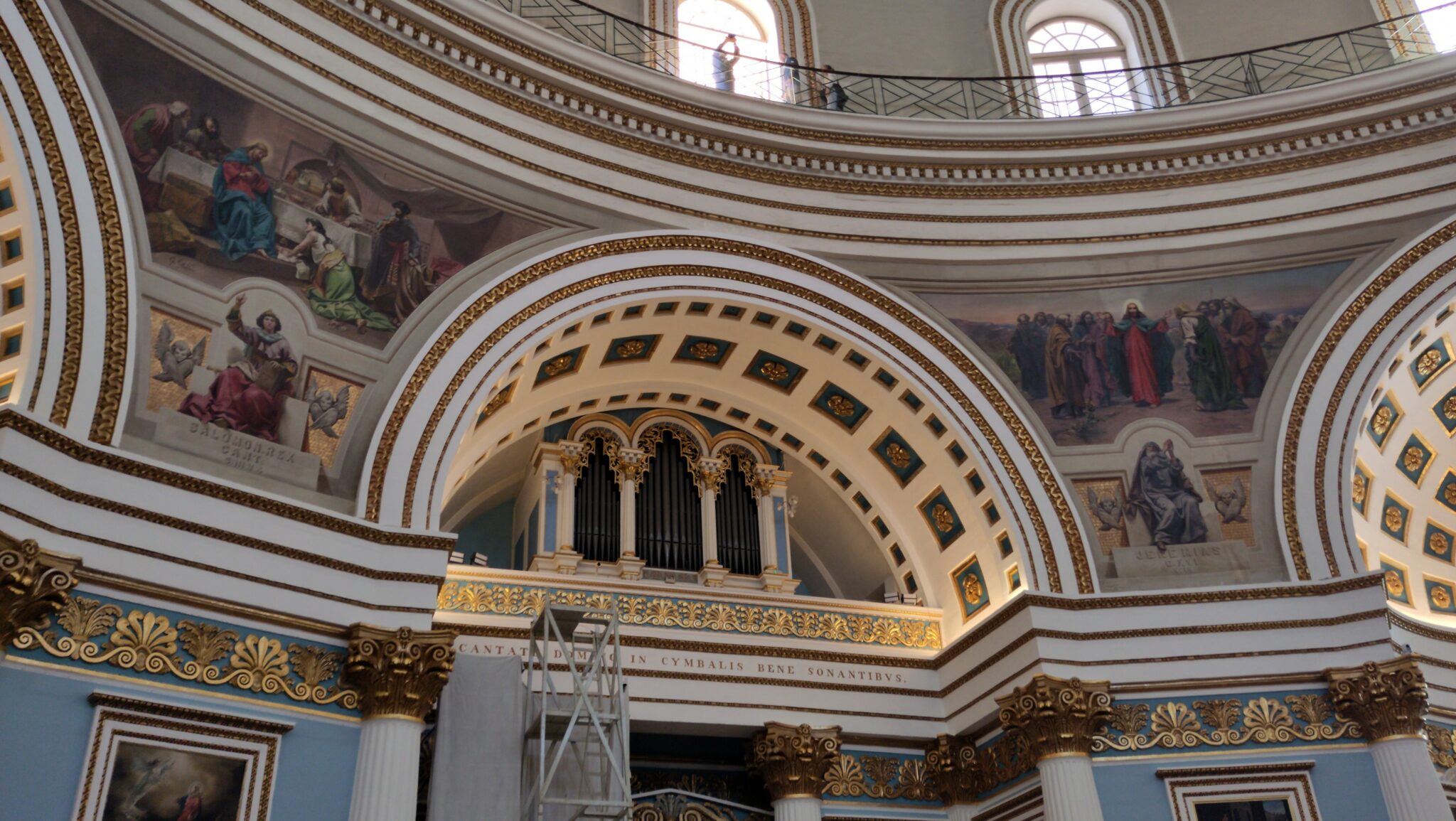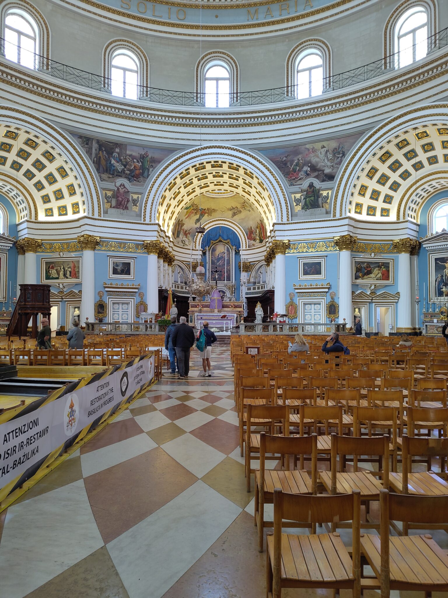 Bus fahren klappt gut, nach einer Dreiviertelstunde sind wir in Mosta. Was will man hier? Eigentlich nur den Dom angucken (oder doch die Basilika? Die Einheimischen sagen Rotunda, ist wohl am einfachsten). Die größte freitragende Kuppel der Welt sagen sie. Ist auch echt groß. Aber erstmal zweites Frühstück. Es gibt maltesisches Omelett und Ftira, eine Art belegtes Fladenbrot, gibt es hier an jeder Ecke.