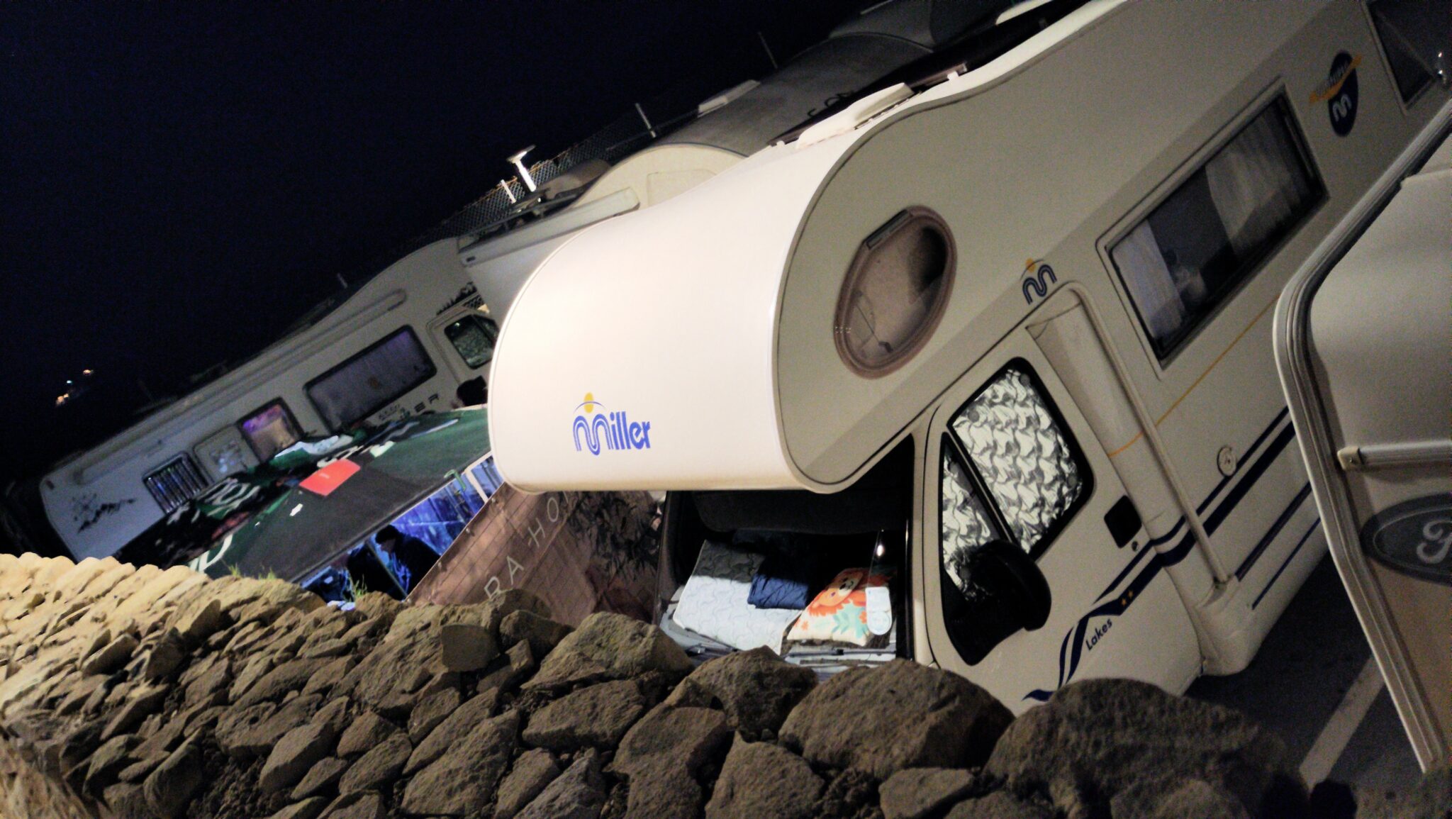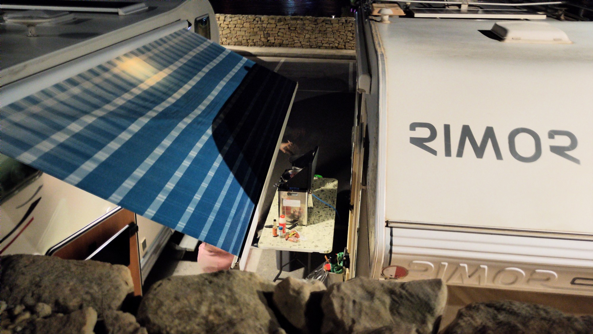 Wir verlassen den Platz im Schlamm. In der Nacht hat es geschüttet und gestürmt, alles klebt, schön ist anders. Irgendwie kommen wir los. Entsorgen im Nassen, alles im Nassen. Wir fahren zum Lidl in Mosta, der hat einen großen Parkplatz. Erstmal beruhigen und weniger schlammige Sachen anziehen, dann gehen wir einkaufen – die Vorräte sind ja doch ziemlich leer.