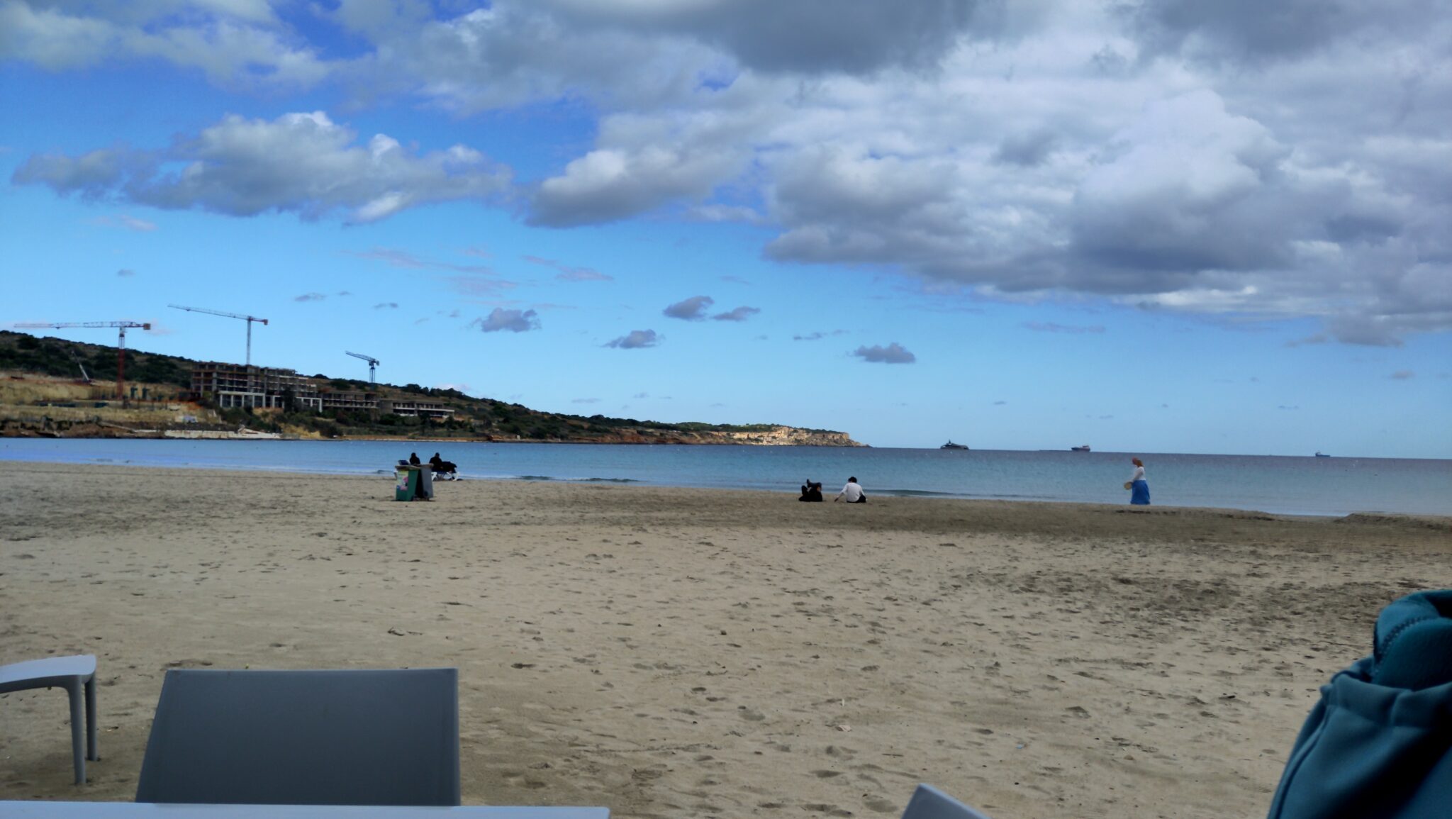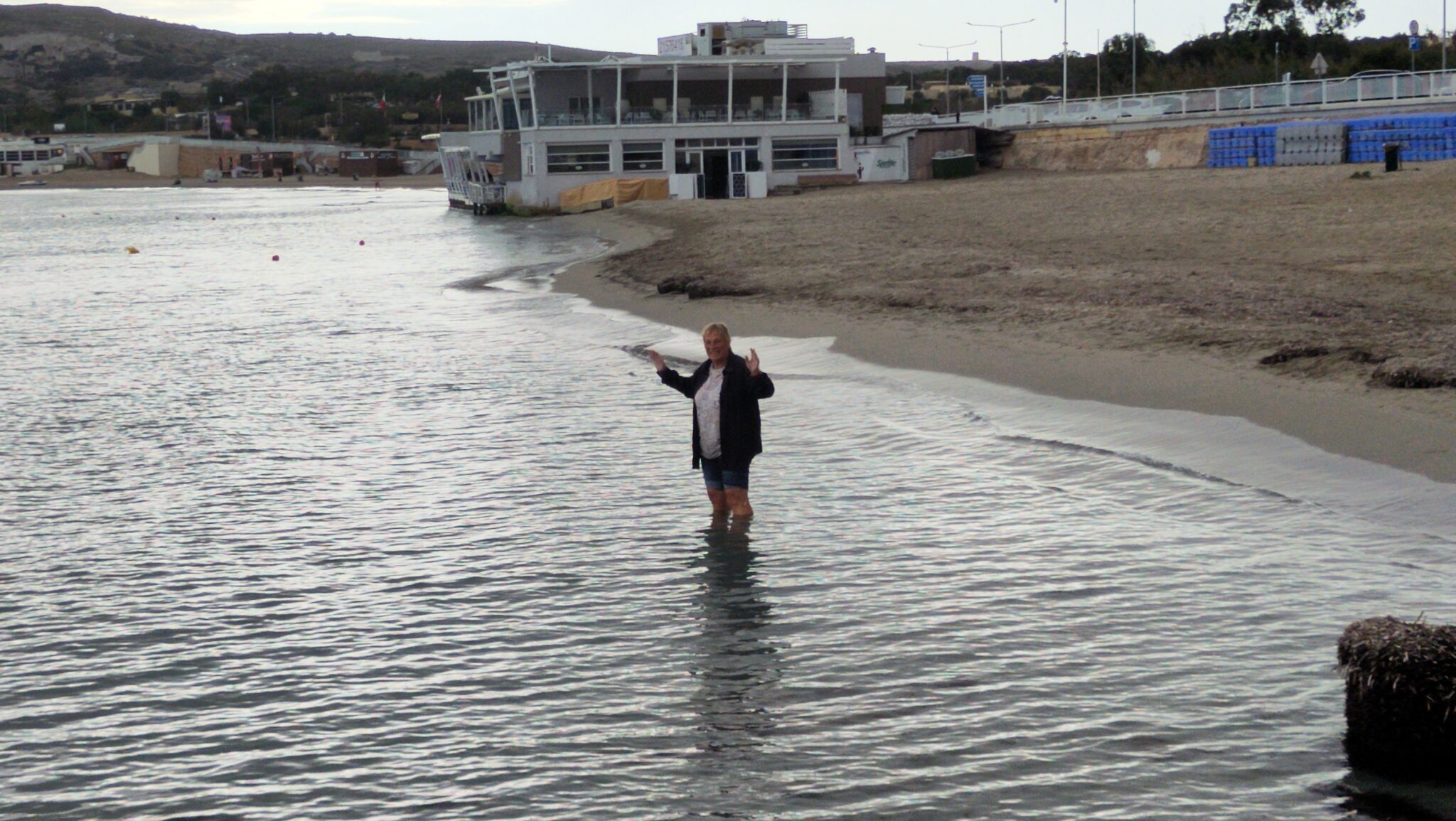 Ein Stück den Berg runter ist ein dänisches Feriendorf. Wir suchen und finden dort Waschmaschinen, die wir benutzen wollen, wenn wir von Gozo zurückkommen. Andrea ist fasziniert von Leuten, die baden und will mindestens die Füße im Wasser haben. Anne friert und macht lieber Fotos davon.