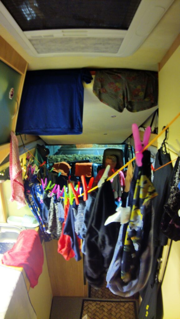 Abends wird dann mal die Wäscheleine im Auto gespannt – die Wäsche kam eher nicht so trocken aus dem Trockner.