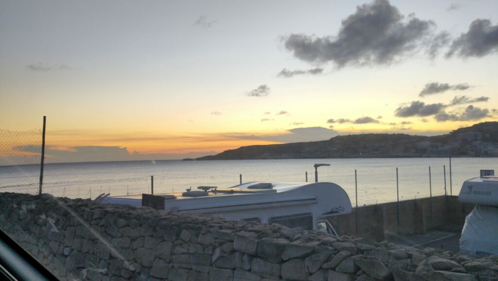 Es kommt ja meistens anders, als man denkt. Donnerstag Morgen fahren wir vom Platz, nochmal einkaufen zum Lidl mit dem großen Parkplatz. Auf dem Weg zur Fähre bricht dann ein Gewitter los, so heftig dass wir eine Weile Pause machen. Als wir dann am Fähranleger ankommen stürmt und schüttet es immer noch. Wir entscheiden, nicht rüber zu fahren. Man könnte zwar, aber was würde das bringen? Also zurück nach Mellieħa, auf den Parkplatz, den wir schon kennen. Zwangspause. Zu arbeiten haben wir genug, also machen wir das beste daraus. Genauso am Freitag, wo es auch viel zu tun gibt.