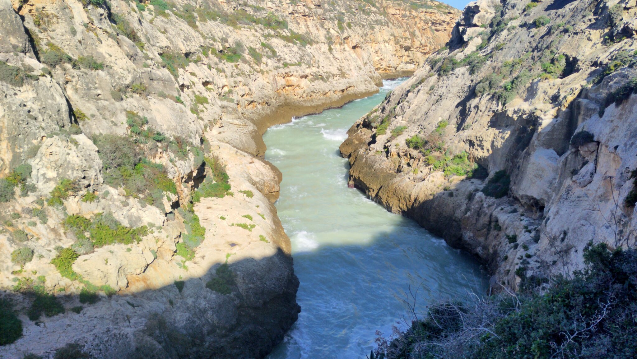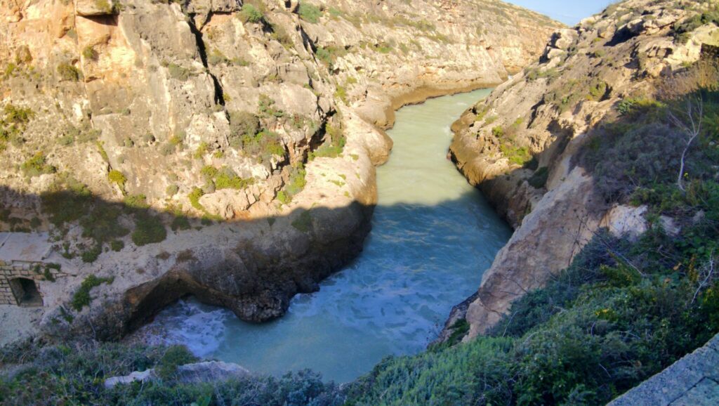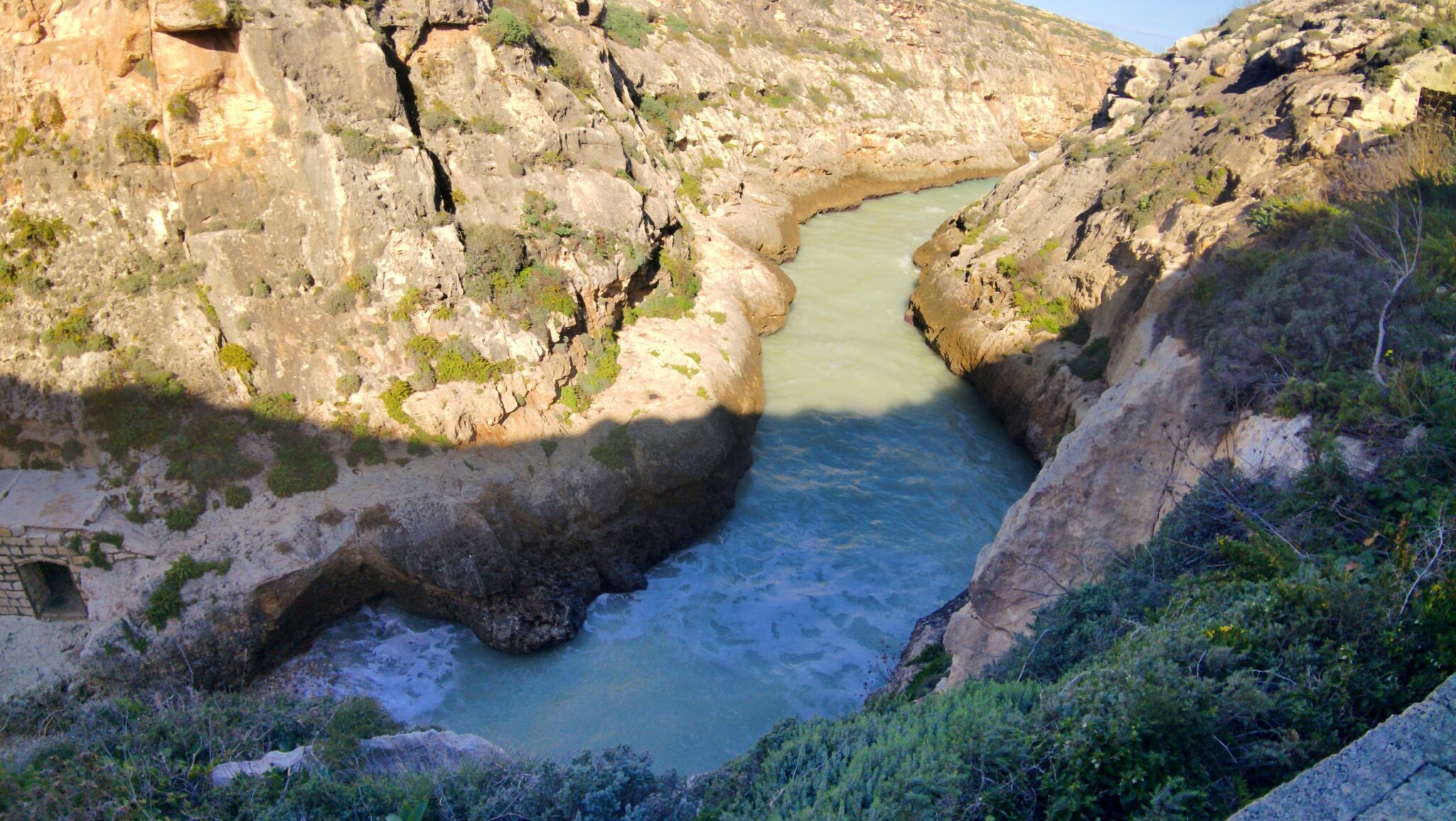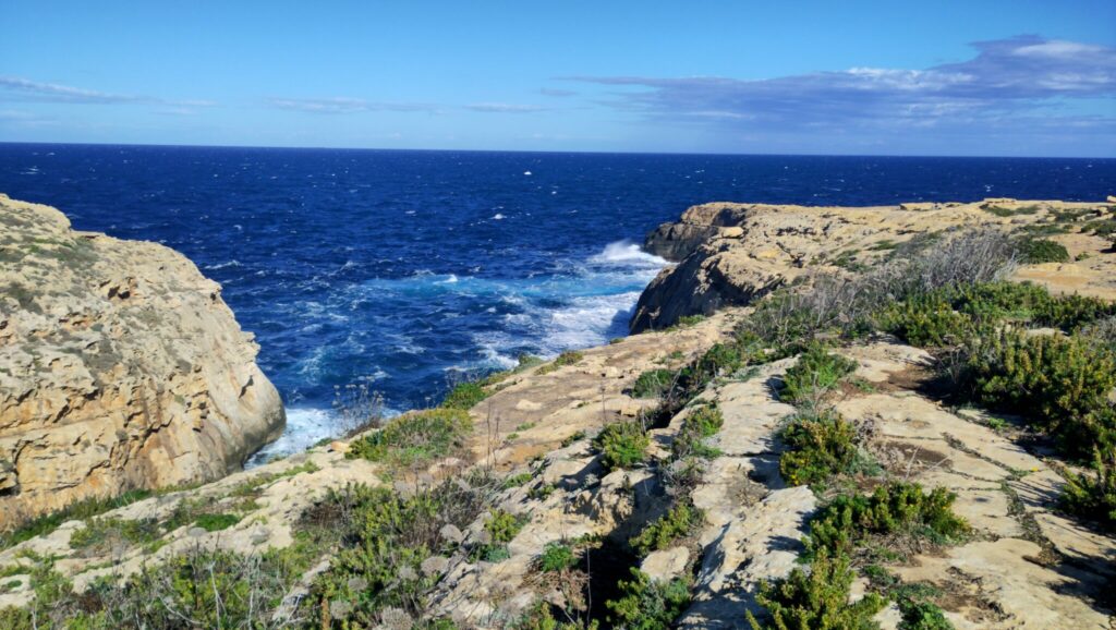 Unser erstes Ziel ist das Wied il-Għasri, ein Meeres-Canyon. Tief eingeschnitten reicht er weit ins Land hinein und hat bei der steifen Brise heute ordentlich Alarm. Die Wellen donnern mit Schmackes an die Felsen, dass man es noch 20 Meter höher spüren kann. Ein faszinierender Ort.