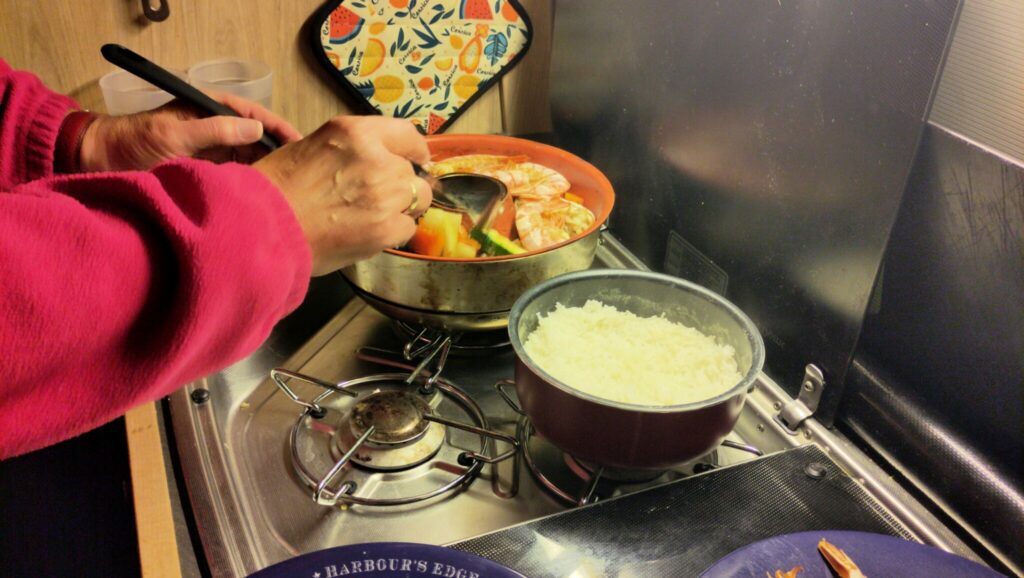 Es schüttet immer noch in Etappen, aber erstmal gibt es Sonntagsfrühstück, da ist das Wetter egal, und weil wir die Markise ausfahren können, kann sogar die Tür aufbleiben.