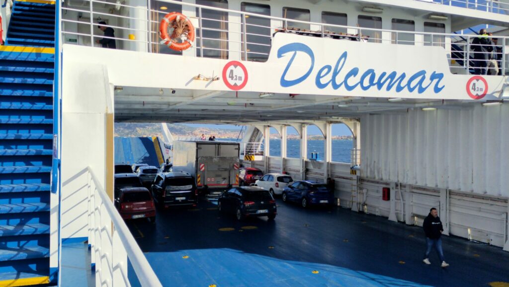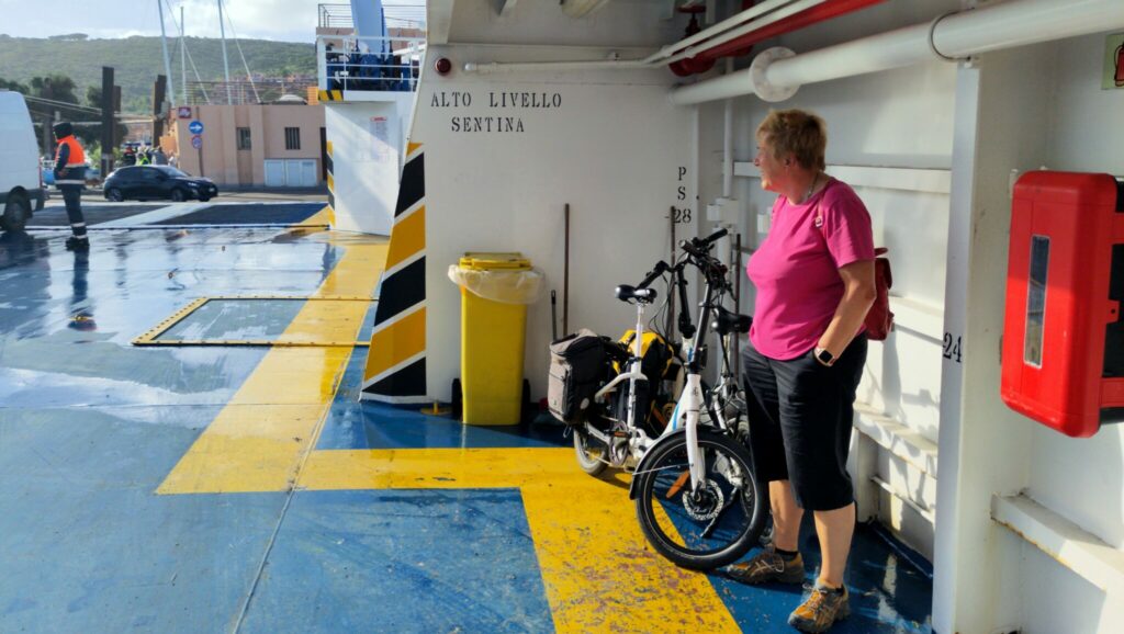 In der Nacht hat es fürchterlich gestürmt – 90km/h mit Spitzen bis 120 km/h lesen wir. Womie hat sehr gewackelt, an Lüften war nicht zu denken. Wir sind beide ganz schön gerädert. Gegen Morgen hat der Wind aber nachgelassen, jetzt nur noch 50-70 km/h, da steht unserer Radtour ja nichts im Weg. Trotzdem, allein die Räder abzuladen ist eine Herausforderung. Aber irgendwann kommen wir los und fahren rüber mit der fast leeren Fähre, die ordentlich schaukelt. Oben an der Reling stehen macht wenig Freude, wir leiben lieber die meiste Zeit bei den Rädern.